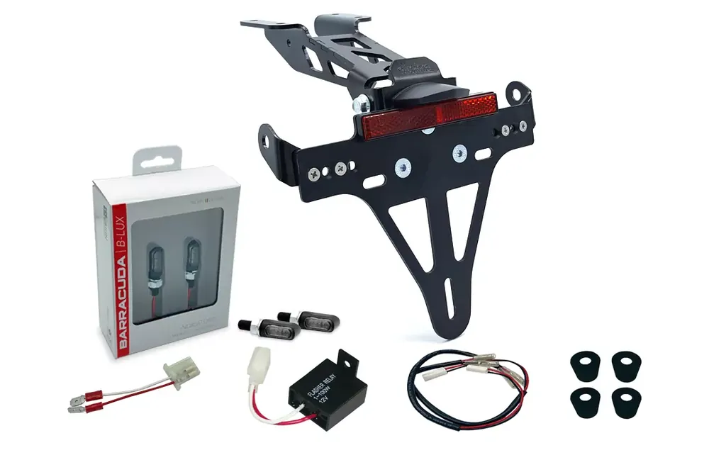Der kurze Kennzeichenhalter überzeugt durch seine präzise Passform und ein hochwertiges Finish aus Edelstahl und Aluminium. Durch die schwarze kathodische Tauchlackierung bzw. Eloxalschicht entsteht eine widerstandsfähige, optisch ansprechende Oberfläche. Dank stufenlos einstellbarem Neigungswinkel und integriertem Zubehörblinker-Halter mit M8-Gewinde passt sich das System ideal an Ihre Anforderungen an. Serienmäßiger Spritzwasserschutz und das Sitzbankschloss bleiben voll funktionsfähig.