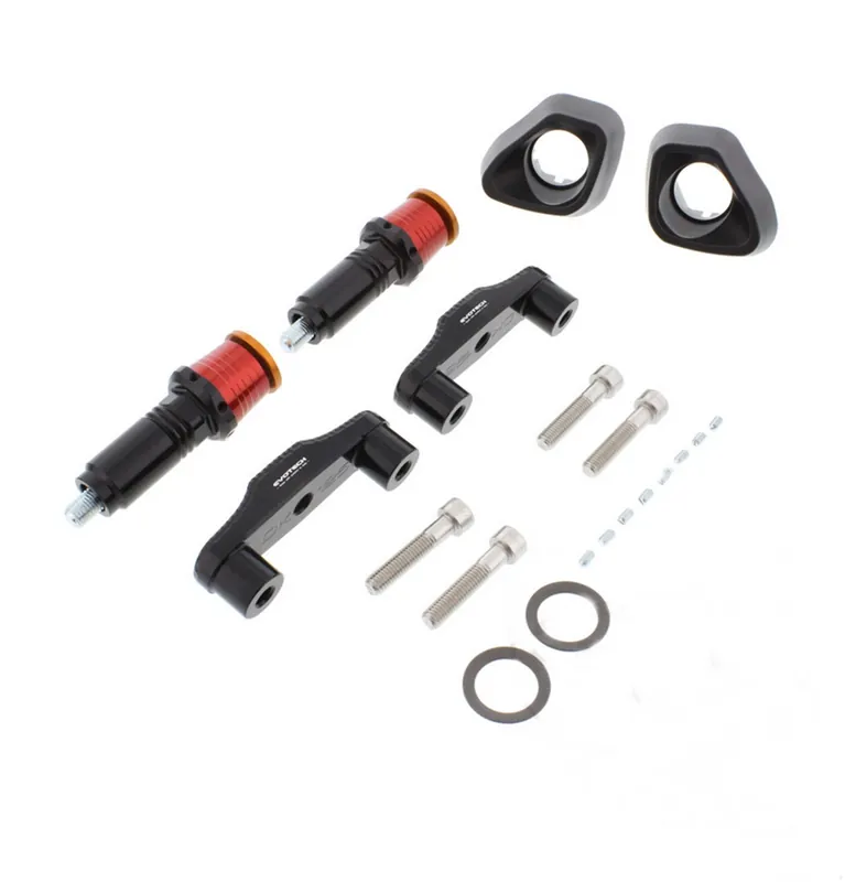 Die aerodynamische Form des Sturzpads verleiht dem Motorrad nicht nur ein aggressiveres Aussehen, sondern reduziert auch die Möglichkeit, dass der Slider beim Aufprall an einem Hindernis hängen bleibt. Auf den Kunststoffpads ist außerdem eine abgestufte Skala eingraviert, die im Falle eines Sturzes einen Hinweis auf die Schlagfestigkeit gibt. Der Hauptteil des Sturzpads besteht aus Billet-Aluminium in Flugzeugqualität und ist für eine lange Lebensdauer in einer schwarzen Eloxalschicht ausgeführt. Sowohl der Durchmesser als auch der Querschnitt sind aufwendig berechnet, um die Belastung des Rahmens im Falle eines Sturzes weiter zu reduzieren.
