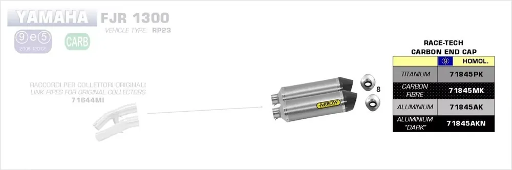 Der Arrow Race-Tech Endschalldämpfer aus Carbon bietet eine perfekte Kombination aus Leistung, Sound und Design. Das moderne Race-Tech-Gehäuse mit Carbon-Endkappe sorgt für eine sportliche Optik und ein aggressives Klangbild. Der Endschalldämpfer wurde fahrzeugspezifisch entwickelt und ist passgenau für die Yamaha FJR 1300 (ab 2016). Durch die hochwertige Verarbeitung aus Carbon überzeugt der Auspuff durch geringes Gewicht, Langlebigkeit und eine hohe Temperaturbeständigkeit. In Kombination mit dem Arrow Verbindungsrohr 71644MI erreichen Sie ein optimales Leistungs- und Klangverhalten für Ihr Motorrad.
