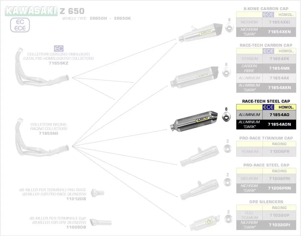 Hinweis: Nur in Verbindung mit Arrow Krümmer 71659KZ (mit Kat) oder 71659MI (ohne Kat). Euro 4–5 Zulassung nur mit Katalysator.