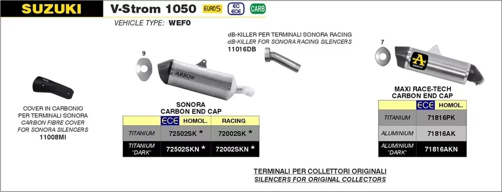 Der ARROW SONORA Titan Endschalldämpfer in Schwarz mit Carbonendkappe überzeugt durch sportliches Design, hochwertiges Material und präzise Verarbeitung. Diese fahrzeugspezifische Ausführung wurde speziell für die Suzuki V-Strom 1050 der Baujahre 2020 bis 2023 entwickelt. Durch den Einsatz von Titan bietet der Schalldämpfer eine deutliche Gewichtsreduktion, was Handling und Agilität positiv beeinflusst. Der Carbon-Endabschluss verleiht dem Fahrzeug einen modernen, dynamischen Look. Die Montage erfolgt an den Original-Anschlusspunkten, wobei der Original-Katalysator erhalten bleibt. Bitte beachten Sie: Dieses Produkt besitzt keine Straßenzulassung und ist ausschließlich für den Rennsport oder den Einsatz auf abgesperrtem Gelände vorgesehen.