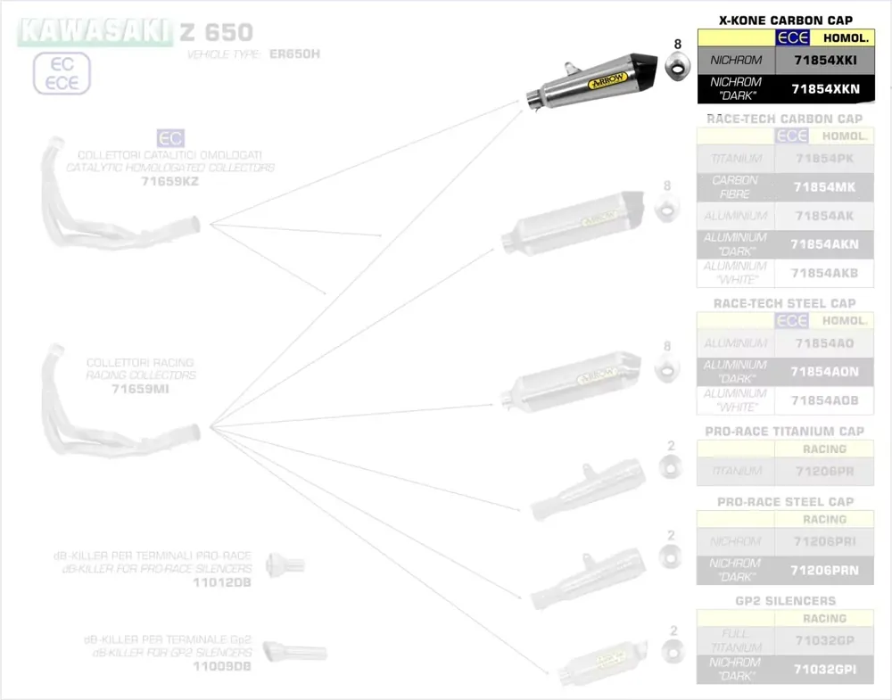 Hinweis: Nur in Verbindung mit Arrow Krümmer 71659KZ (mit Kat) oder 71659MI (ohne Kat). Zulassung Euro 4-5 nur in Verbindung mit Kat.