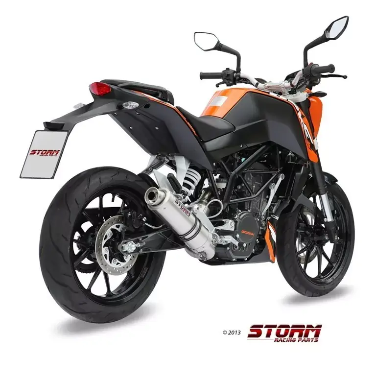 Die Storm by MIVV GP Komplettanlage bietet Ihnen eine sportliche Auspufflösung aus robustem Edelstahl, die ideal passend für KTM 125 Duke (2011–2016) und KTM 200 Duke (2012–2014) entwickelt wurde. Diese Auspuffanlage überzeugt durch eine gesteigerte Performance, einen kernigen Sound und eine attraktive Optik im klassischen GP-Stil. Zudem entfällt der Originalkatalysator, wodurch mit dem optional erhältlichen Nachrüstkat ACC.033.A1 eine legale Nutzung ermöglicht wird. Durch das verwendete Edelstahlmaterial bietet die Anlage höchste Langlebigkeit und Korrosionsbeständigkeit. Sie ist EC-geprüft und somit straßenzugelassen.