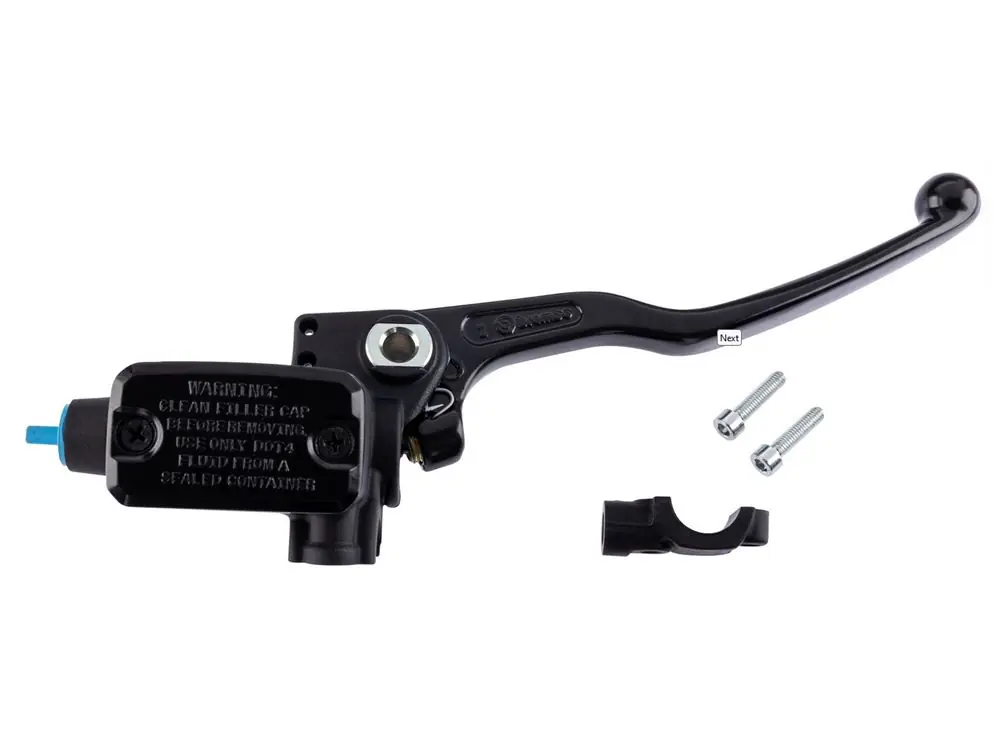 Handbremszylinder PS 13 Brembo schwarz, mit eckigem Behälter, 13 mm Kolben Hebel schwarz, mit Spiegelaufnahme verstellbar, Gewicht 354 gr. 19,5 ccm Behälterinhalt DOT4