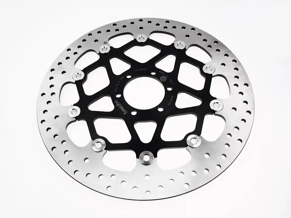 Schwimmend gelagerte Bremsscheiben bestehen aus einem Bremsband aus Edelstahl, das über 10 Mitnehmerbolzen mit dem Innenteil aus CNC-bearbeiteter und anschließend eloxierter Aluminiumlegierung verbunden ist. Die schwimmend gelagerten Bremsscheiben von Brembo bieten dank der Fertigung mit Materialien höchster Qualität absolute Spitzenleistungen.
