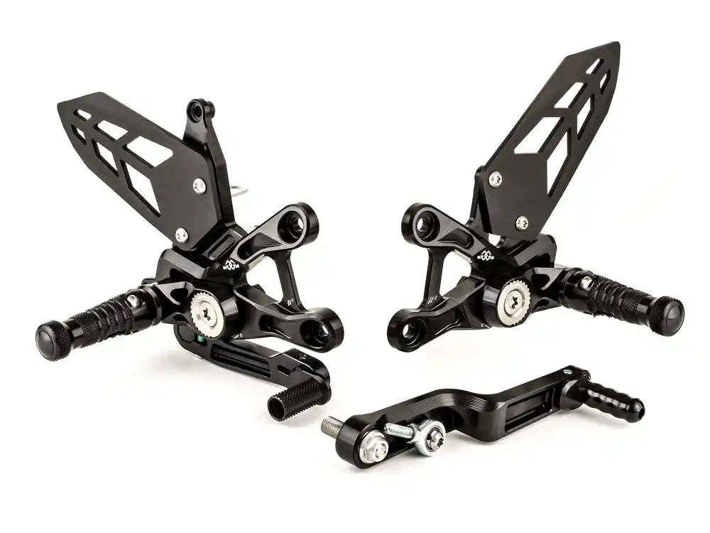 Die Positionen von Fußrasten sowie Brems- und Schalthebeln sind nach eigenen Wünschen frei einstellbar. Die Positionierung der Fußrasten erfolgt durch eine Kombination aus schieb- und drehbarer Einstellung an nur einem Punkt, so ist diese extrem schnell und einfach wählbar (fünf Positionen durch schieben und vier Positionen durch drehen). Der Umbau auf Umkehrschaltung erfolgt durch das einfache verdrehen des Schaltarms. Brems- und Schalthebel sind doppelt kugelgelagert für perfekt spielfreie Funktion der Hebel, über Exzenter lassen sich die Trittstücke je nach Wunsch einstellen. Aluminiumfersenschützer beidseitig runden den Lieferumfang ab. Diese Anlage ist mit klappbaren Rasten ausgestattet.
