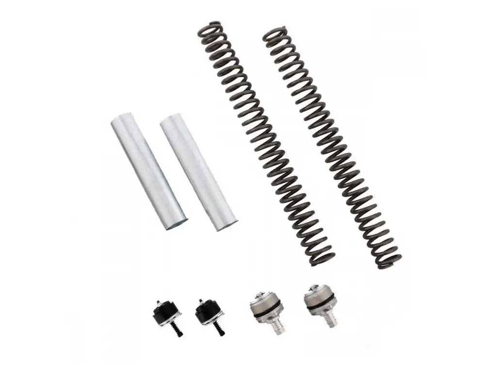 Das YSS Gabel Upgrade Kit enthält eine straffere Gabelfeder sowie ein Gabelventil und einen einstellbaren Gabelholmverschluss. Das Gabelventil verändert den Ölfluss in der Gabel in beide Richtungen und die Gabelfeder bewirkt ein strafferes Federverhalten.