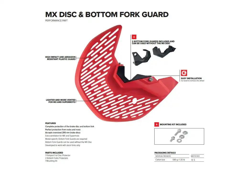 Der hochfester und abriebresistente Bremsscheibenschutz aus Kunststoff schützt die Bremsscheibe, den unteren Gabelteil und die Bremszange vor Steinen, Schmutz und Rost.