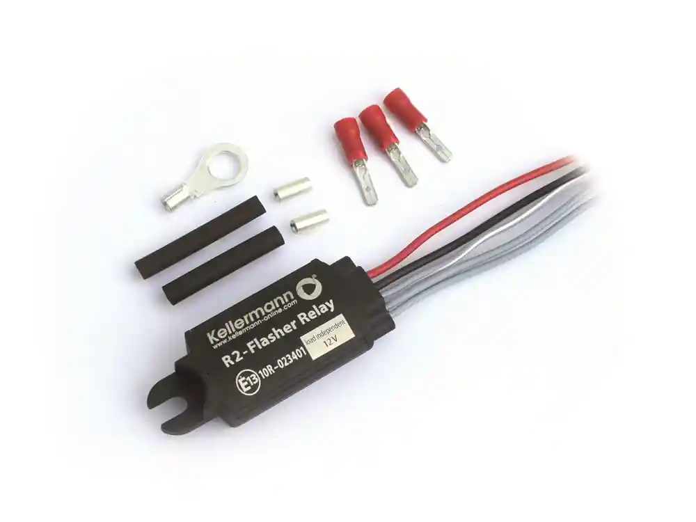 Das lastunabhänige Kellermann Blinkrelais R2 ist der universelle Problemlöser bei der Verwendung von LED- und Halogenblinkern. Es ersetzt alle original 2-3 poligen Blinkrelais und sorgt für eine konstante und korrekte Blinkfrequenz. Der Anschluss ist einfach. Sollten nach einer Umrüstung auf LED-Blinker die nicht betätigten Blinker ungewollt mitblinken, genügt es, das Relais mit einem linken und einem rechten Blinker zu verbinden, um diesen Effekt zuverlässig zu beseitigen. Im Lieferumfang sind alle notwendigen Bauteile für den Einbau enthalten. Ggf. muss die Warnblinkanlage deaktiviert werden. Das Produkt ist ECE-geprüft