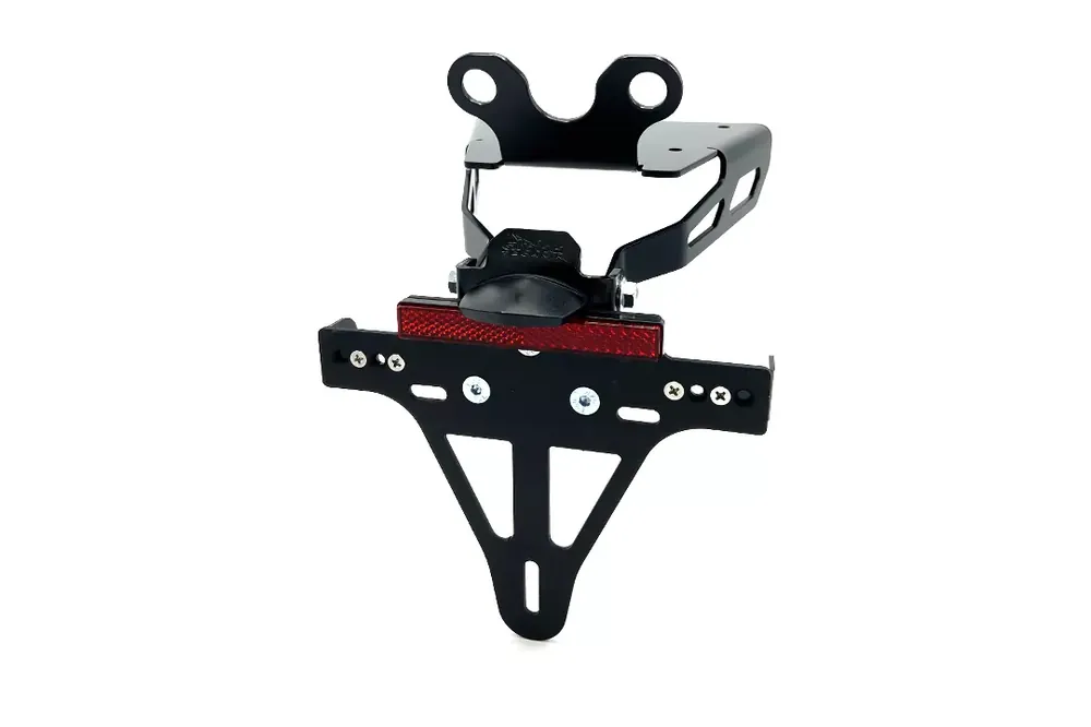 Mit integriertem Rückstrahler und Kennzeichenbeleuchtung (beide mit E-Prüfzeichen) sorgt der Kennzeichenhalter für gesetzeskonforme Sicherheit. Die Neigung ist stufenlos verstellbar, wodurch Sie das Kennzeichen individuell anpassen können. Der Abstand der Blinker ist variabel einstellbar und erfüllt somit aktuelle Richtlinienvorgaben. Im Lieferumfang enthalten sind alle benötigten Befestigungsmaterialien für die Montage sowie Halter für Zubehörblinker mit M8- und M10-Gewinde. Der Halter ist ideal für Kennzeichen mit einer Breite von etwa 180 mm ausgelegt.