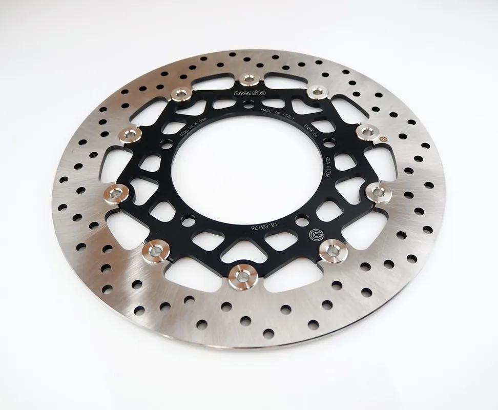 Schwimmend gelagerte Bremsscheiben bestehen aus einem Bremsband aus Edelstahl, das über 10 Mitnehmerbolzen mit dem Innenteil aus CNC-bearbeiteter und anschließend eloxierter Aluminiumlegierung verbunden ist. Die schwimmend gelagerten Bremsscheiben von Brembo bieten dank der Fertigung mit Materialien höchster Qualität absolute Spitzenleistungen.