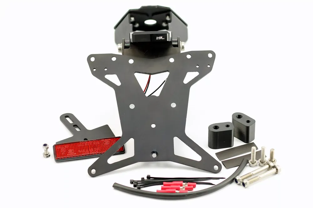 Der MG Biketec Kennzeichenhalter passend für Aprilia Tuono 660 / Factory ab 2021 überzeugt durch präzise Verarbeitung, sportliches Design und eine einfache Montage. Gefertigt aus hochwertigem CNC-gefrästem Aluminium, sorgt die matt-schwarz eloxierte Oberfläche für maximale Haltbarkeit und ein edles Finish. Der Kennzeichenträger ist voll verstellbar, was Ihnen erlaubt, den Nummerntafel-Winkel individuell anzupassen. Dank der Aufnahme für Originalblinker bleibt die werkseitige Optik erhalten, während das Heck Ihres Motorrads gleichzeitig deutlich aufgewertet wird.