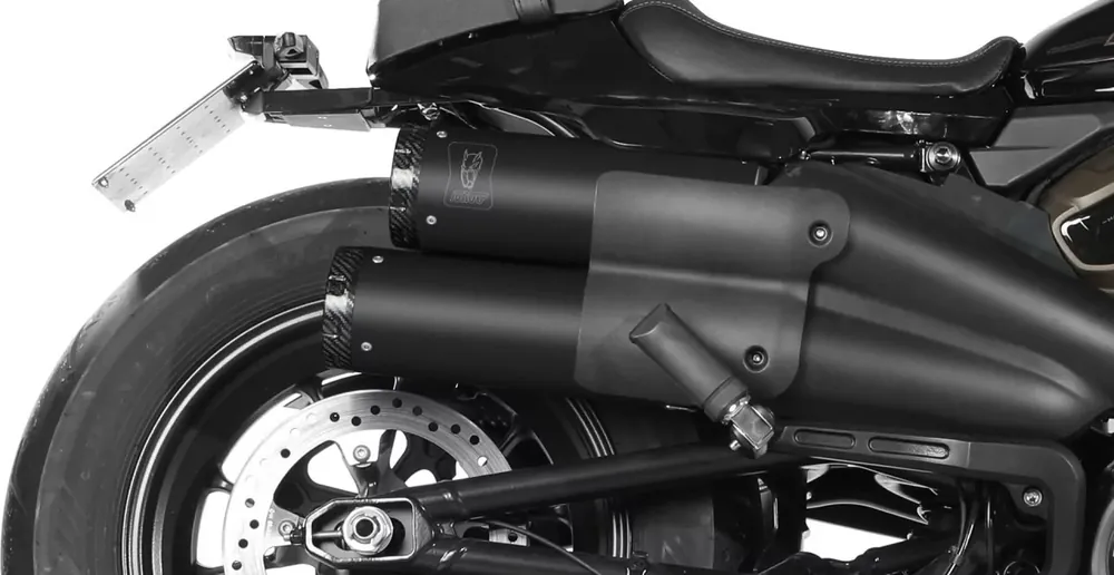 Der MIVV HR-1 Endschalldämpfer aus schwarzem Edelstahl mit eleganter Carbonendkappe überzeugt durch eine sportliche Optik und kraftvollen Sound. Die Anlage wurde speziell entwickelt, um perfekt passend für Harley Davidson Sportster S 2021–2024 zu sein. Das exklusive Design unterstreicht den individuellen Charakter Ihres Motorrads, während das widerstandsfähige Material einen langlebigen Einsatz garantiert. Für Euro‑5-Konformität ist der optionale Nachrüstkatalysator ACC.041.A2 erforderlich.