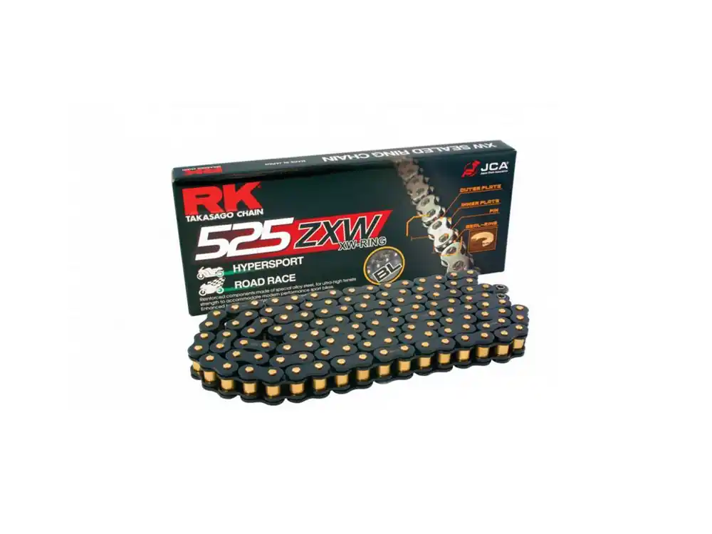 Seit über 45 Jahren stellt der japanische Hersteller RK Takasago hochwertige Ketten für Motorräder her. Ob als Erstausrüster namenhafter Hersteller oder Rennsportteams – alle vertrauen der Erfahrung und dem Know How Traditionsherstellers. Die ZXW-Kette ist eine Weiterentwicklung der GXW-Serie und zeichnet sich durch eine äußerst hohe Zugfestigkeit aus.