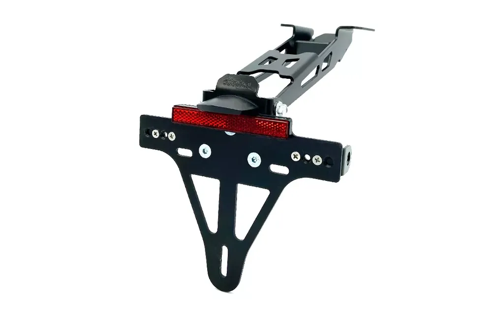 Die Neigung des Kennzeichens ist stufenlos einstellbar, wodurch Sie die optimale Ausrichtung individuell anpassen können. Der Halter wird mit einer E-geprüften Kennzeichenbeleuchtung und einem Rückstrahler geliefert, sodass alle gesetzlichen Anforderungen erfüllt sind. Durch die variable Blinkeraufnahme (M8 und M10) können gängige Zubehör-Blinker problemlos montiert werden. Adapter für originale Blinker sind separat erhältlich.