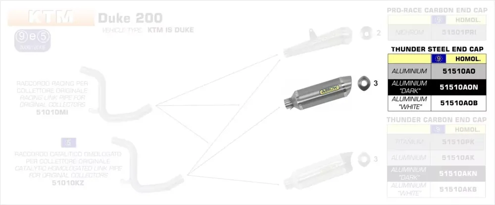 Der Endschalldämpfer ist speziell fahrzeugspezifisch entwickelt und passt perfekt am Heck der KTM Duke 125 (2011–2016) sowie KTM Duke 200 (2011–2014). In Kombination mit dem passenden Krümmer (51010KZ mit Kat oder 51010MI ohne Kat) erfüllt diese Anlage die Euro-3/4-Norm.