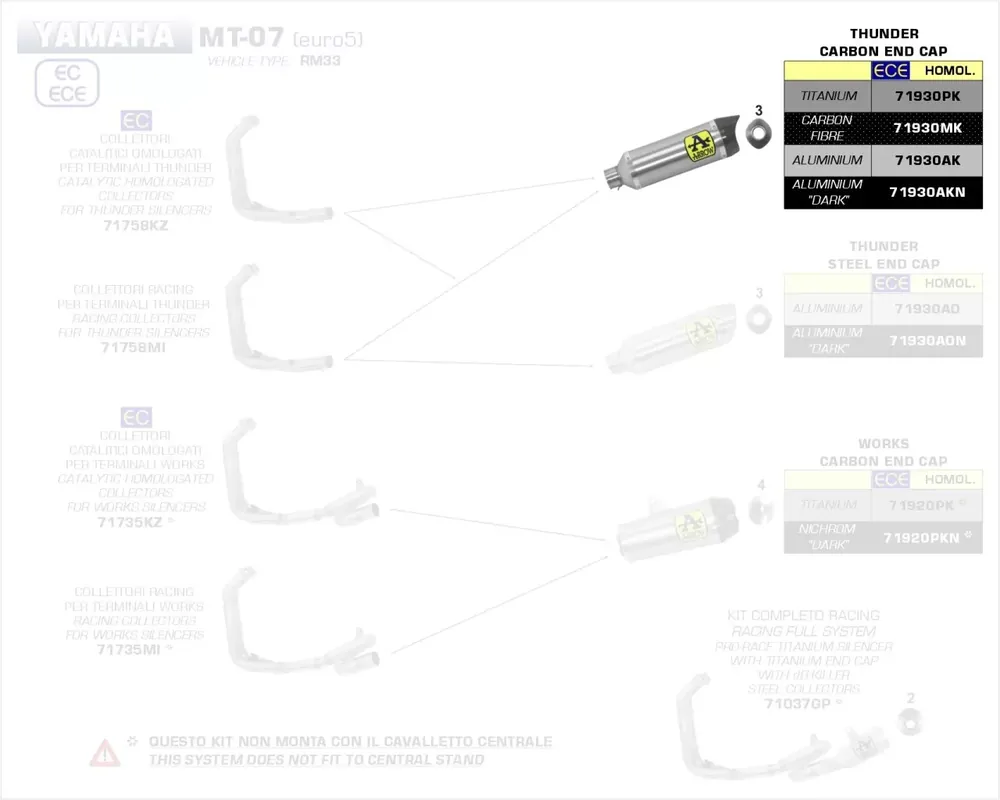 Der Arrow Thunder Endschalldämpfer aus hochwertigem Aluminium mit edler Carbonendkappe verleiht Ihrer Yamaha MT-07 (ab 2021) nicht nur eine markante Optik, sondern sorgt auch für einen sportlich-dynamischen Sound. Durch das leichte Aluminiumgehäuse wird das Gesamtgewicht reduziert, was die Performance und das Handling Ihres Motorrads verbessert. Der Endschalldämpfer besitzt die Arrow-typische Thunder-Form, welche Strömungsverluste minimiert und für eine optimale Abgasführung sorgt. Die Euro-5-Zulassung gilt nur in Kombination mit dem Katalysator (71758KZ). Für den reinen Rennstreckeneinsatz ist auch die Kombination mit Zwischenrohr 71758MI ohne Kat möglich.