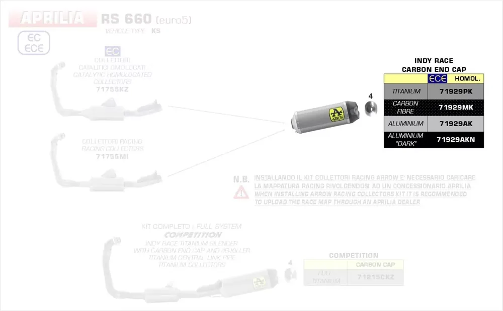Hinweis: Originalkat entfällt. Verwendung nur in Verbindung mit Arrow Krümmer 71755KZ (mit Kat) oder 71755MI (ohne Kat). Euro 5 Zulassung nur in Verbindung mit Kat.